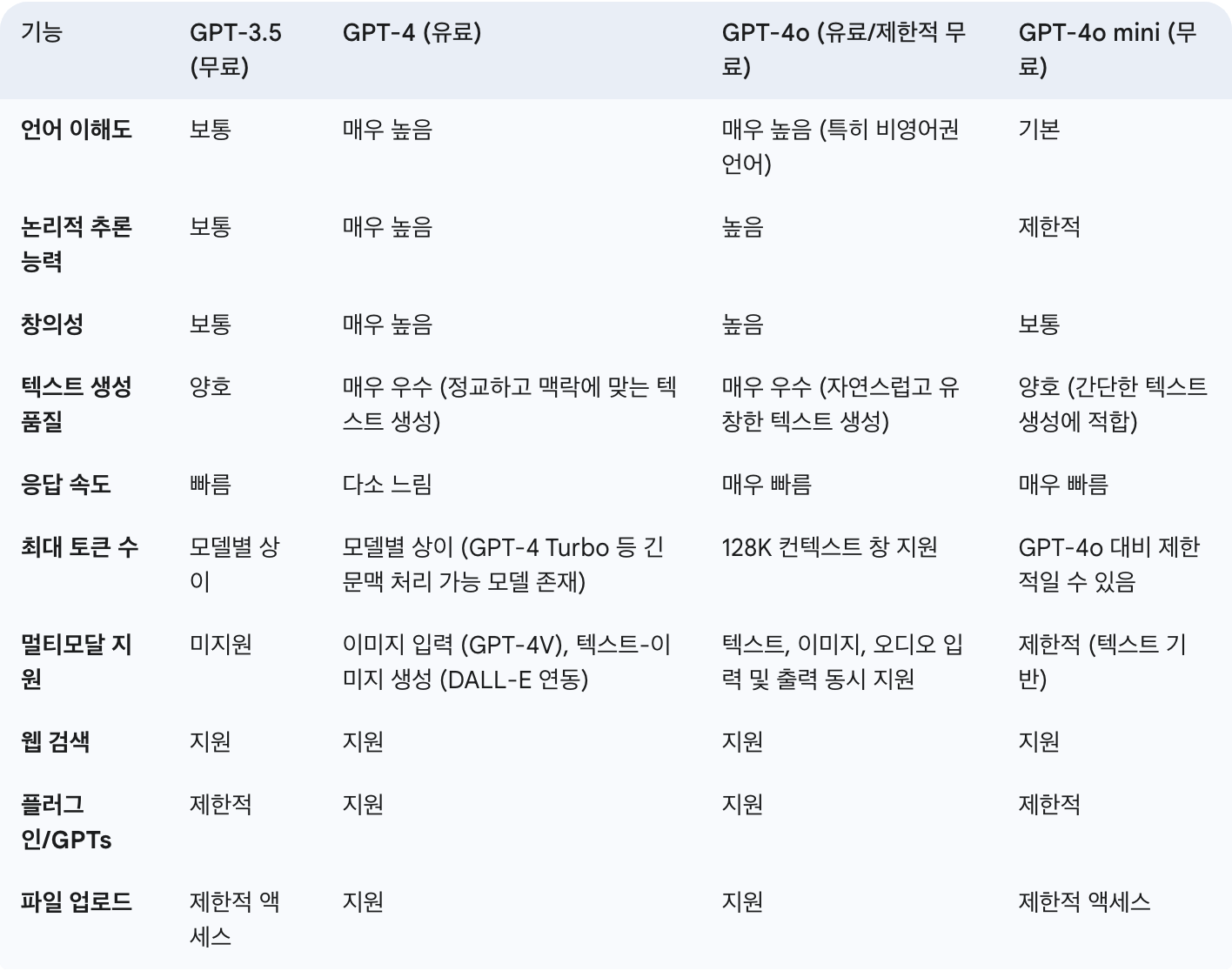 - 무료 버전 (GPT-3.5, GPT-4o mini):
